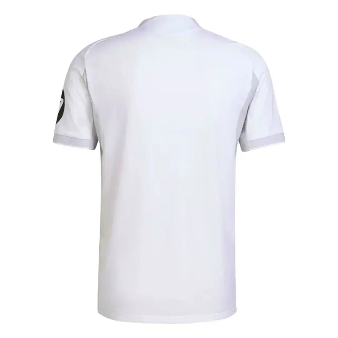 Real Madrid 2025/26 iç saha forması, klasik beyaz tonun üzerine işlenmiş ince detaylarıyla sade ama güçlü bir görünüm sunuyor. Göğüs bölümündeki arması, modern yaka tasarımı ve forma üzerindeki minimal dokular, formaya özel bir kimlik katıyor.